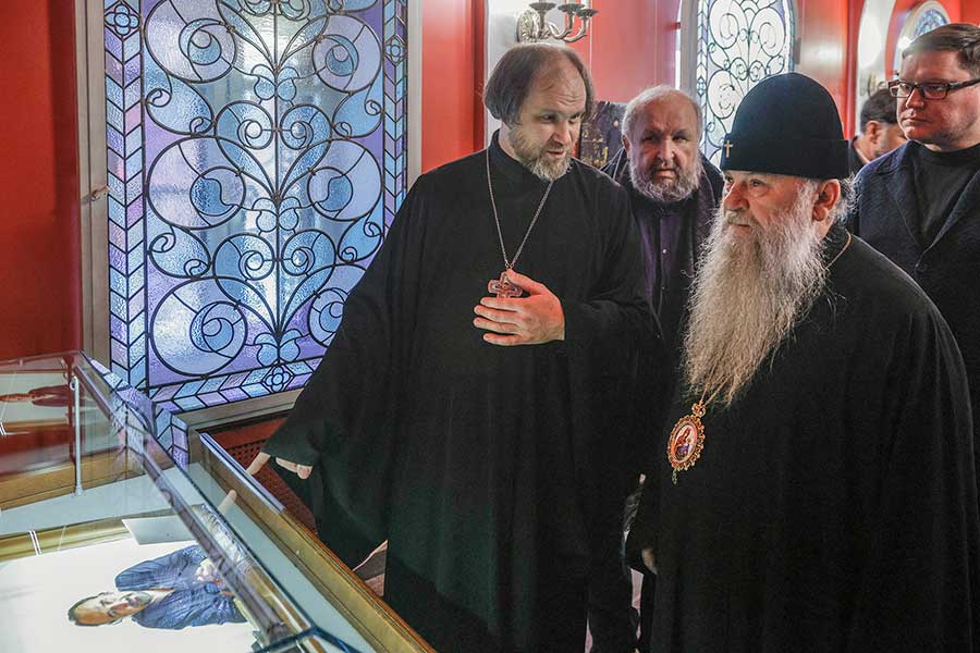 14 ноября, на следующий день после торжественного открытия, фотовыставку священника Игоря Палкина «Потомки и наследники святых» посетил митрополит Санкт-Петербургский и Ладожский Варсонофий. Высокого гостя сопровождали директор Государственного музея «Исаакиевский собор» Юрий Витальевич Мудров вместе с автором фоторабот, заведующим фотослужбой Патриарха Московского и всея Руси иереем Игорем Палкиным. Владыка Варсонофий, чье благословение предварило открытие выставки, внимательно ознакомился с работами, каждая из которых представляет глубокий духовный образ и является частью истории церкви.