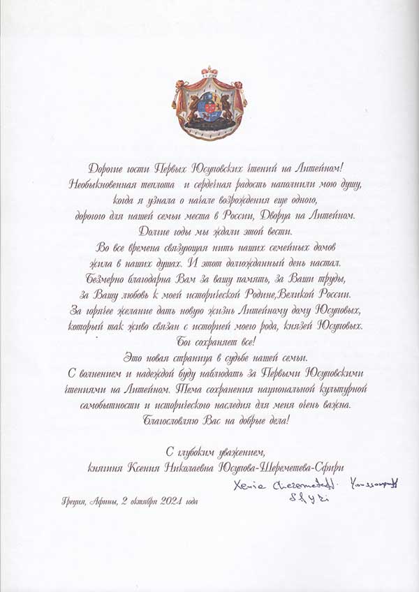 К участникам и гостям чтений обращается Ксения Николаевна Юсупова-Шереметева-Сфири, прямой потомок бывших владельцев и строителей дворца.