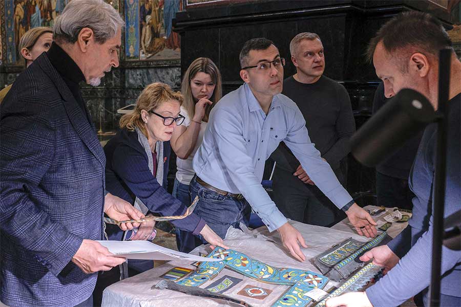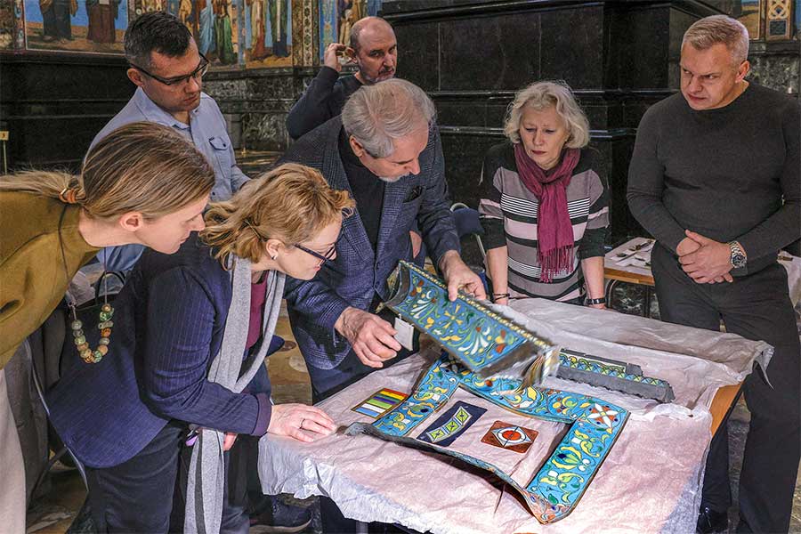 Основная тема встречи – работы по воссозданию складней алтарной преграды главного иконостаса. По итогам были определены и согласованы ключевые художественные решения: цветовая гамма эмалей, изображения ликов святых. Мероприятие явилось важным этапом комплексного научного подхода к восстановлению уникального памятника.