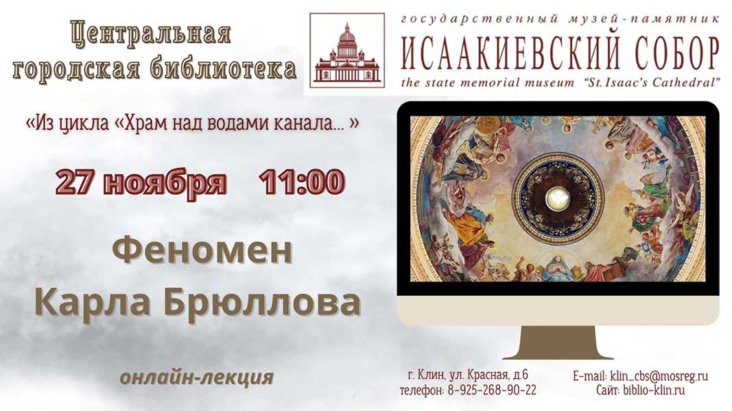 27 ноября на базе Центральной городской библиотеки города Клина прошла онлайн-встреча «Феномен Карла Брюллова» с членами клинского Общества слепых и слабовидящих, подготовленная сектором по работе с маломобильными посетителями Государственного музея «Исаакиевский собор».