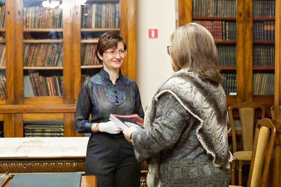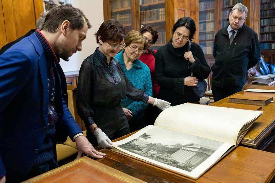 На следующий день в рамках мероприятия для докладчиков было организовано посещение Научно-технической библиотеки Петербургского государственного университета путей сообщения Императора Александра I для знакомства с коллекцией книг из личной библиотеки Монферрана.