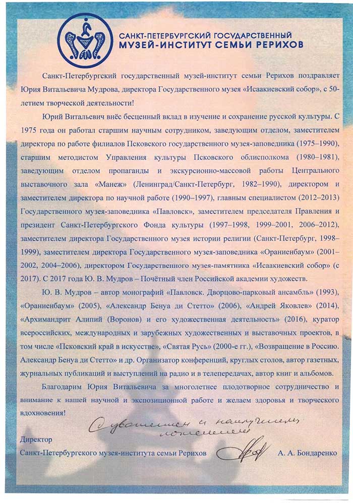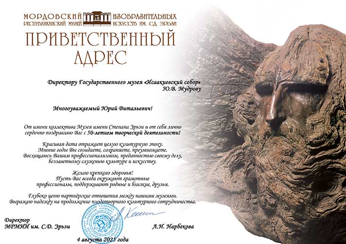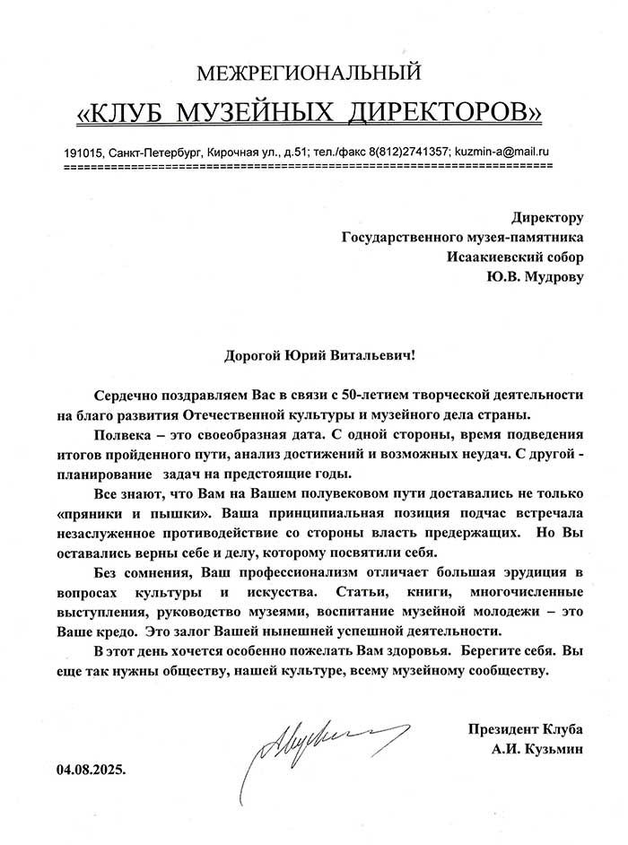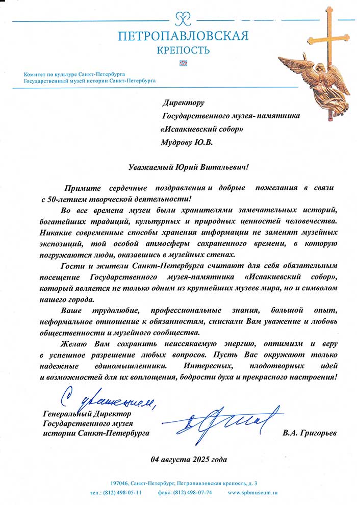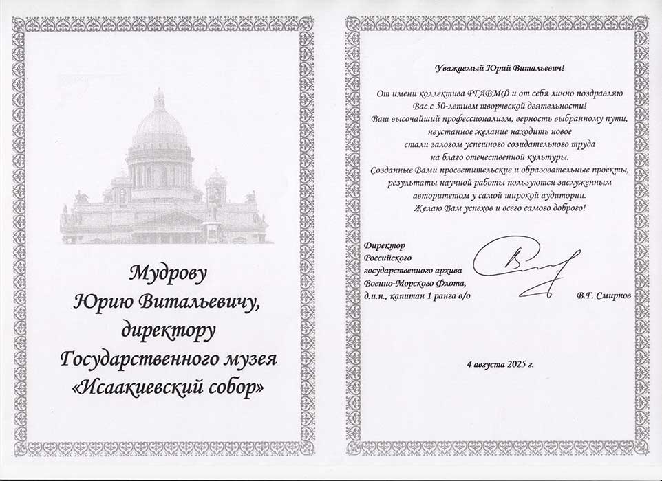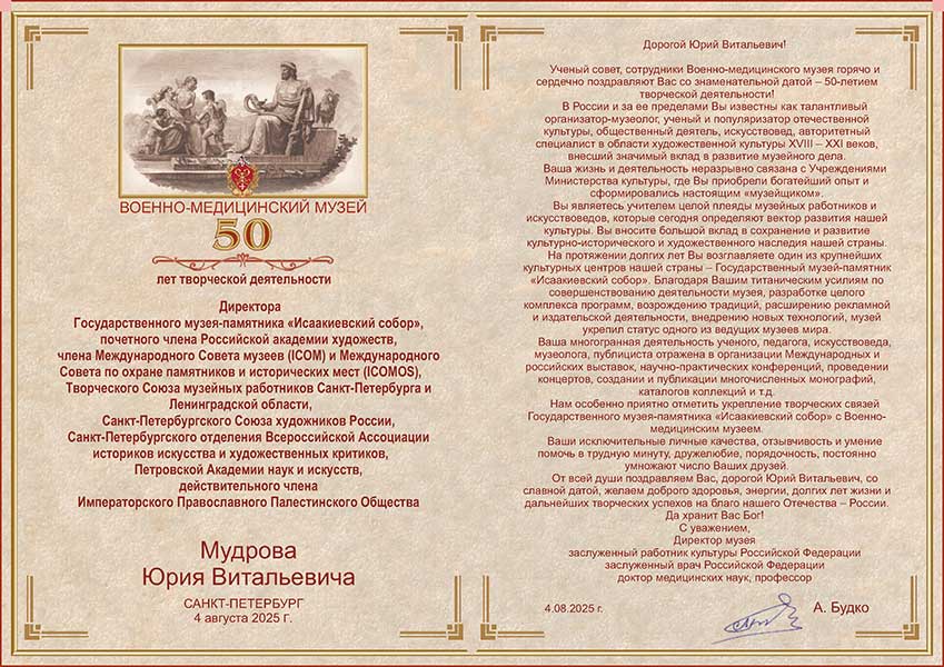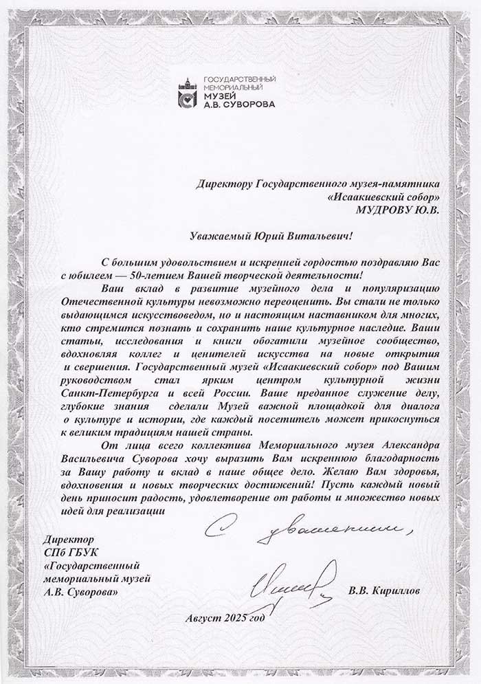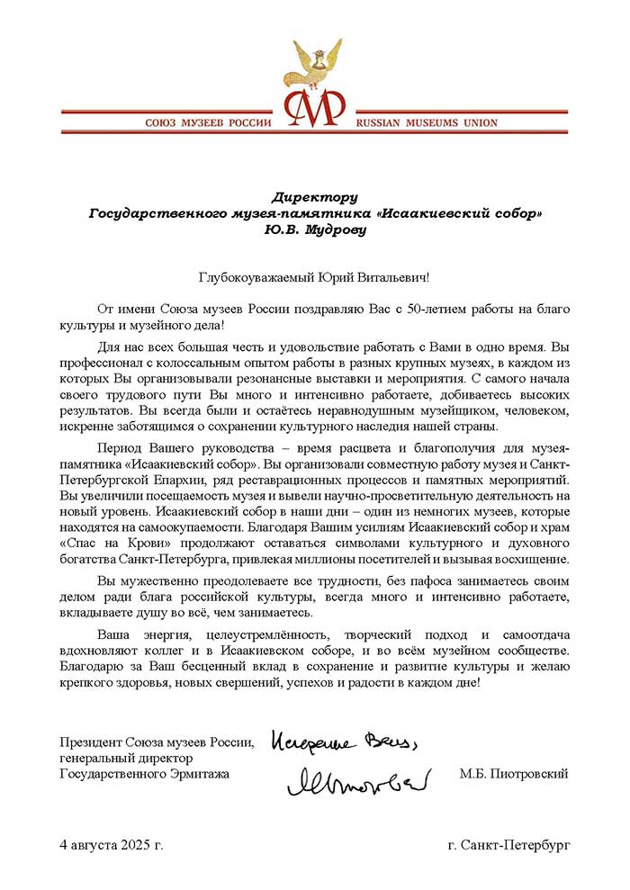 4 августа исполняется 50 лет творческой деятельности директора Государственного музея «Исаакиевский собор» Юрия Витальевича Мудрова. С юбилеем его поздравил генеральный директор Государственного Эрмитажа, президент Союза музеев России Михаил Борисович Пиотровский.