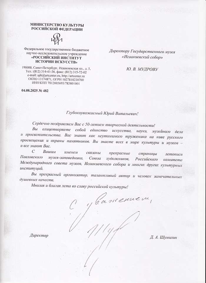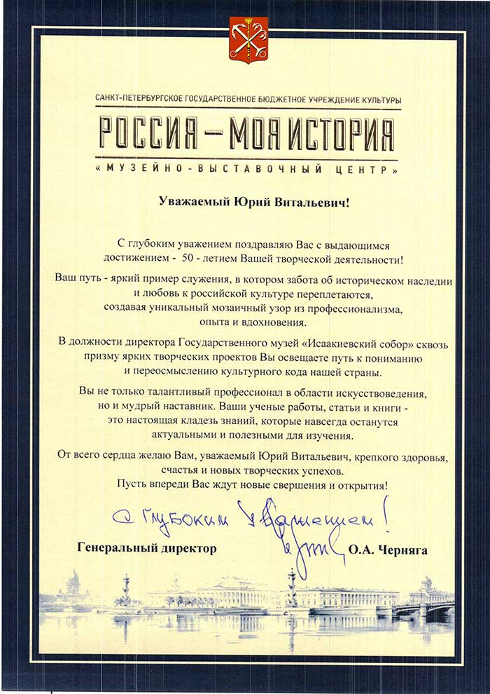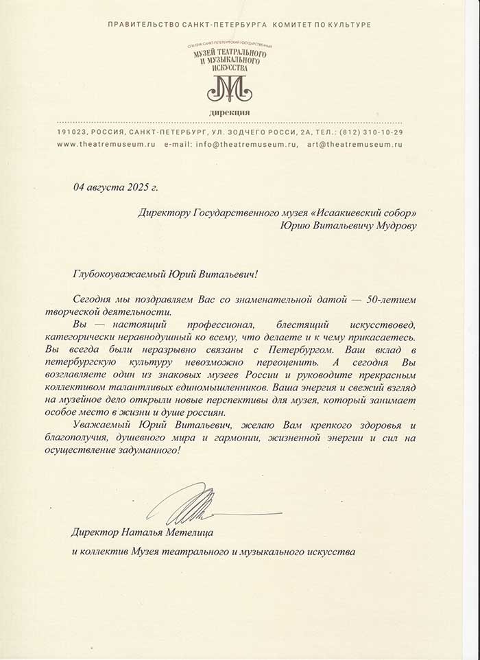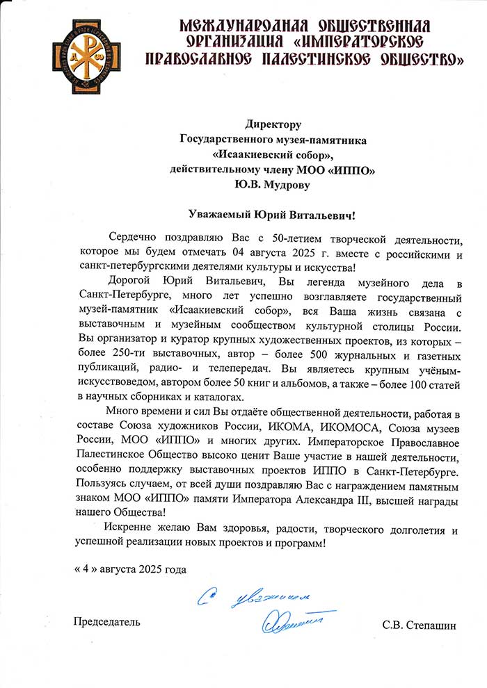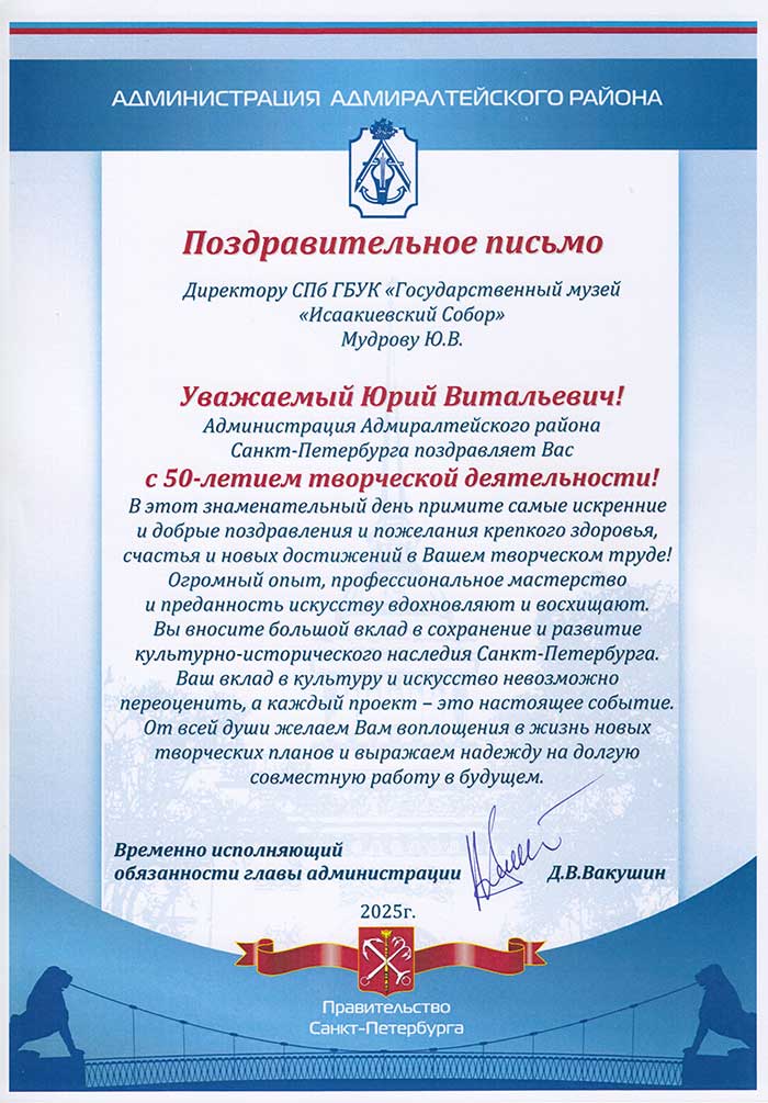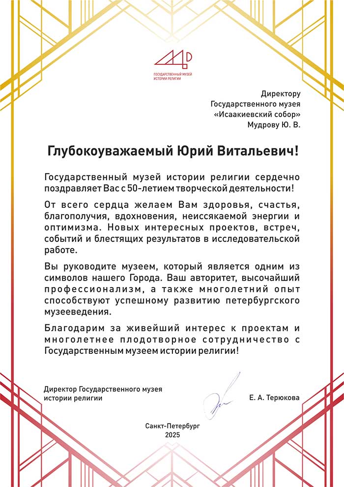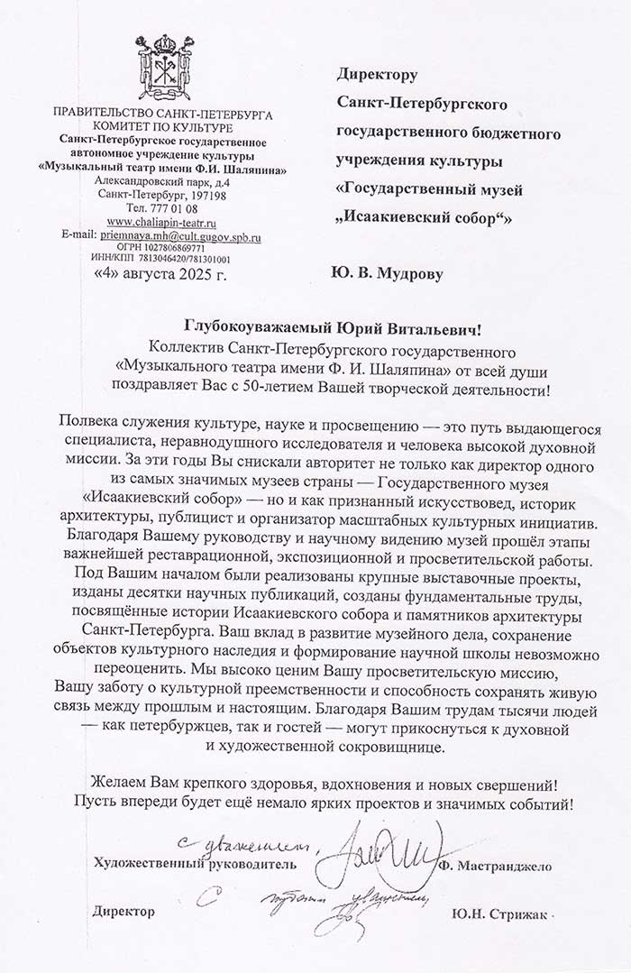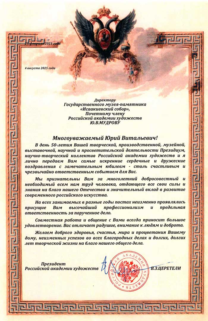 4 августа исполняется 50 лет творческой деятельности директора Государственного музея «Исаакиевский собор» Юрия Витальевича Мудрова. С юбилеем его поздравил генеральный директор Государственного Эрмитажа, президент Союза музеев России Михаил Борисович Пиотровский.