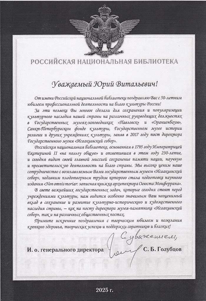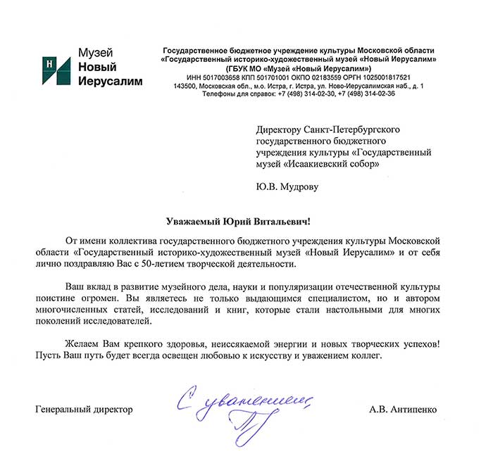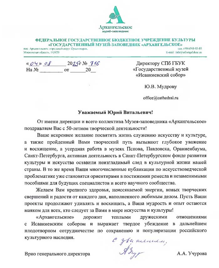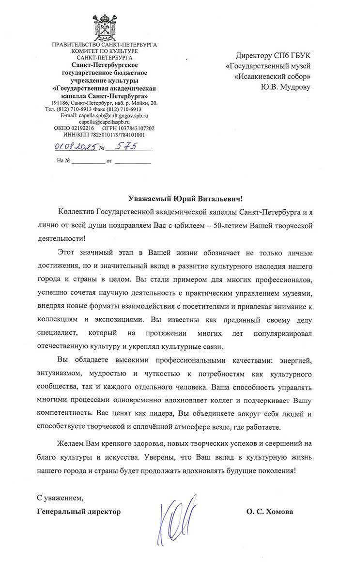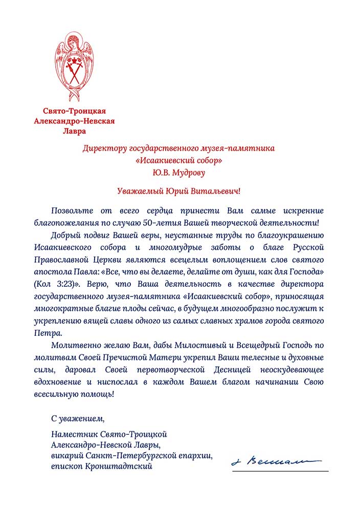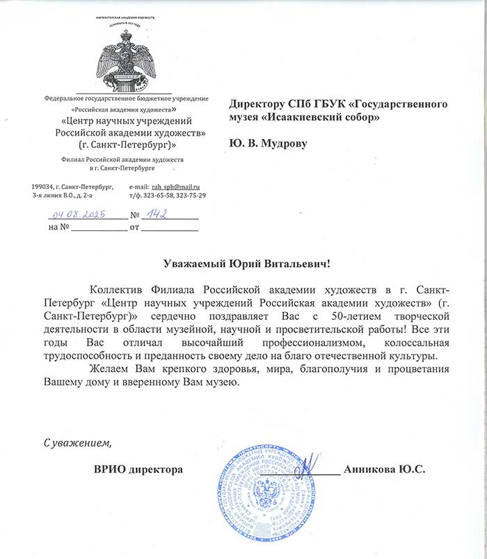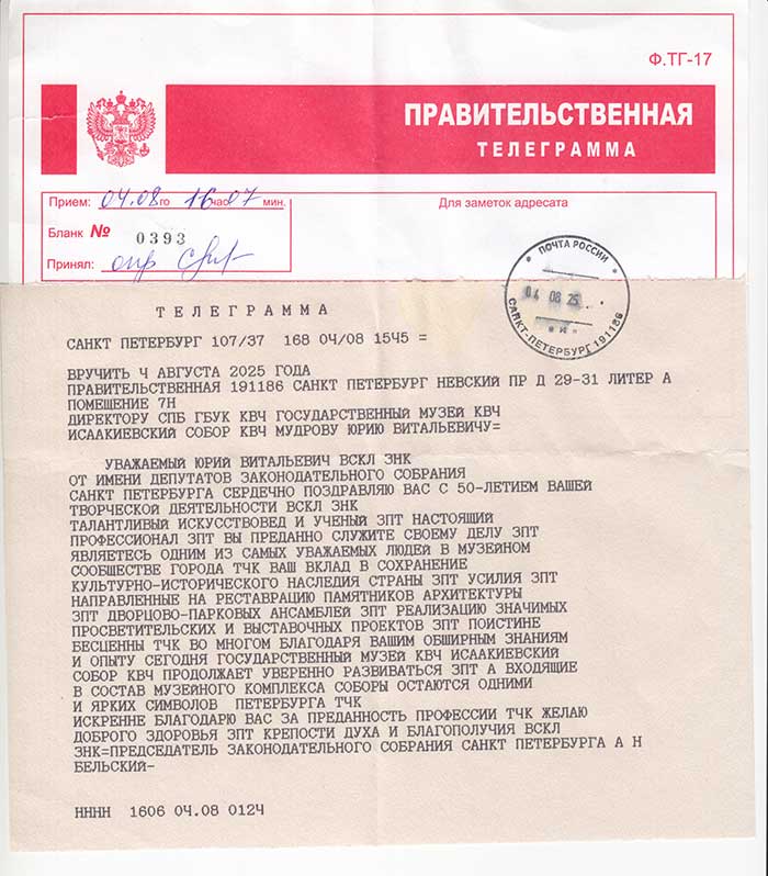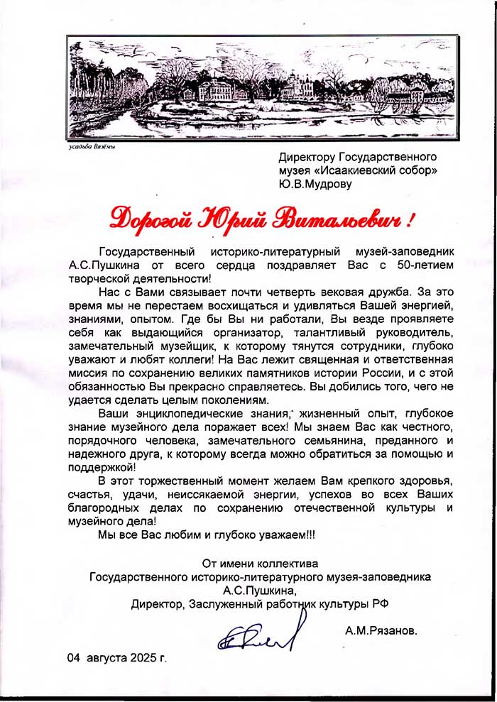 4 августа исполняется 50 лет творческой деятельности директора Государственного музея «Исаакиевский собор» Юрия Витальевича Мудрова. С юбилеем его поздравил генеральный директор Государственного Эрмитажа, президент Союза музеев России Михаил Борисович Пиотровский.