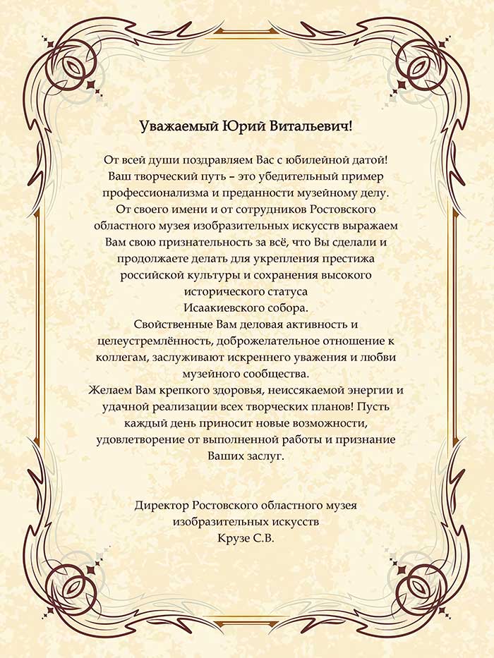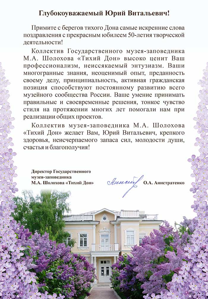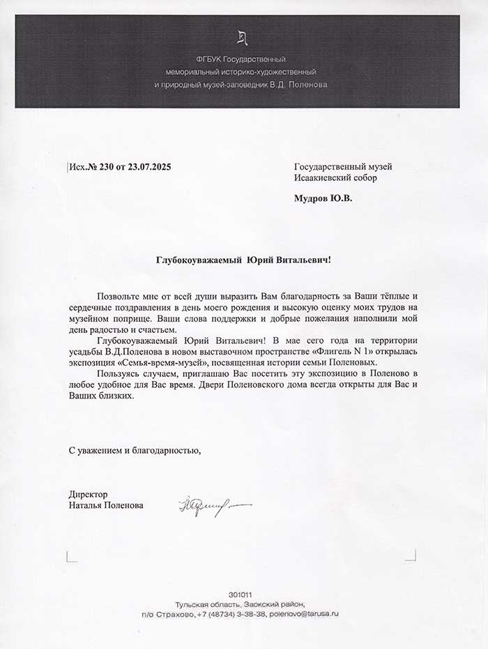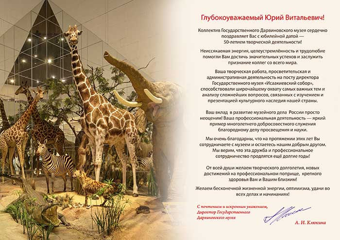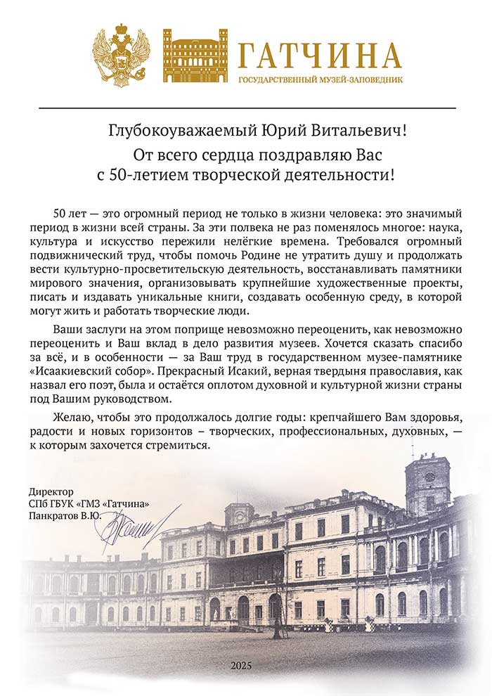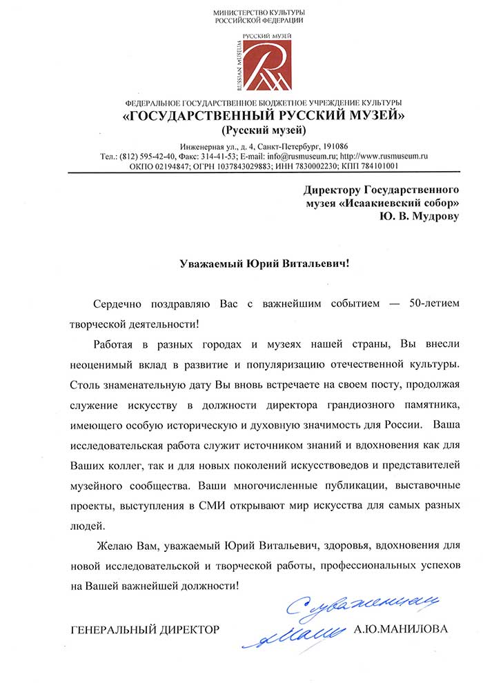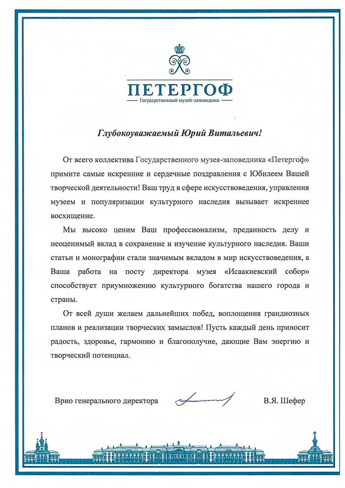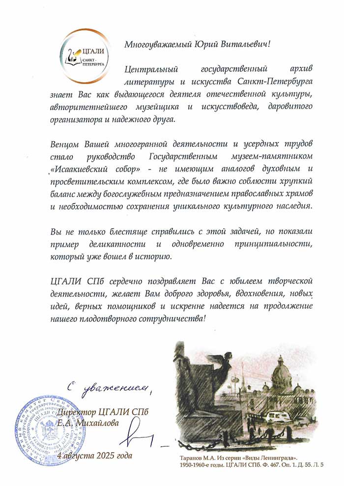4 августа исполняется 50 лет творческой деятельности директора Государственного музея «Исаакиевский собор» Юрия Витальевича Мудрова. С юбилеем его поздравил генеральный директор Государственного Эрмитажа, президент Союза музеев России Михаил Борисович Пиотровский.