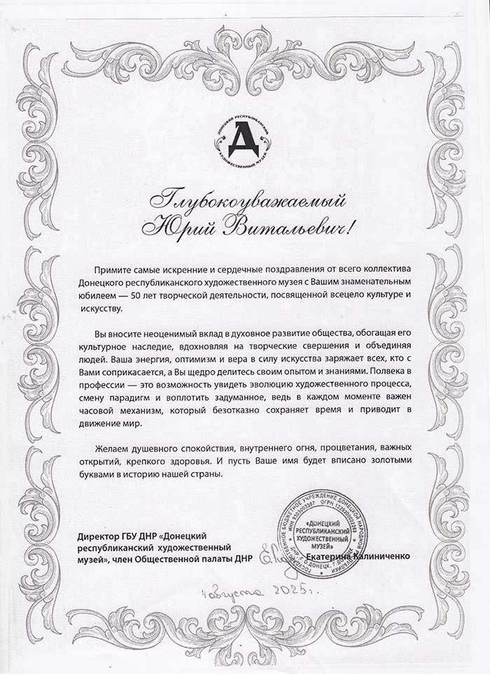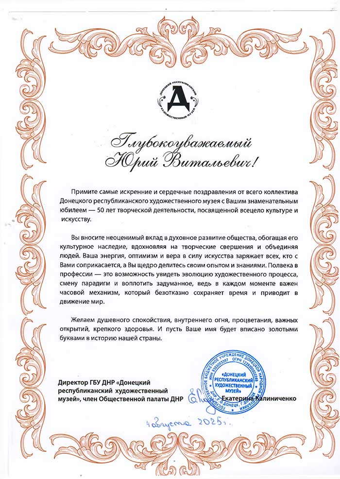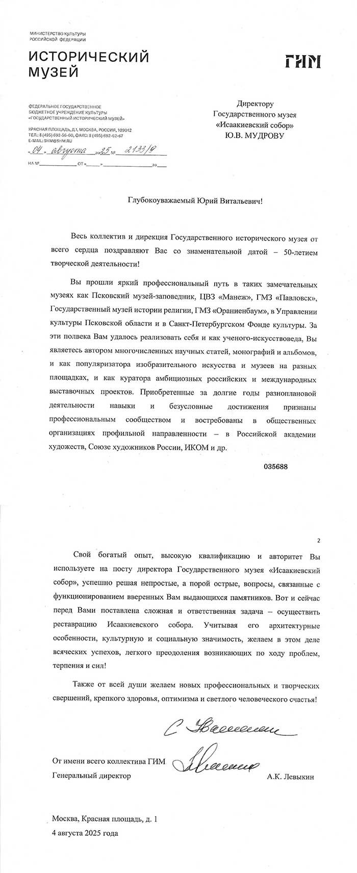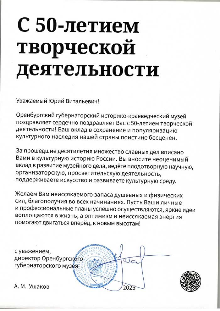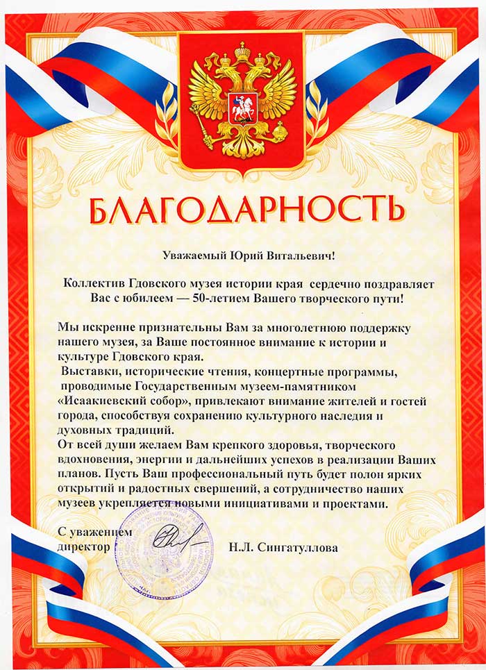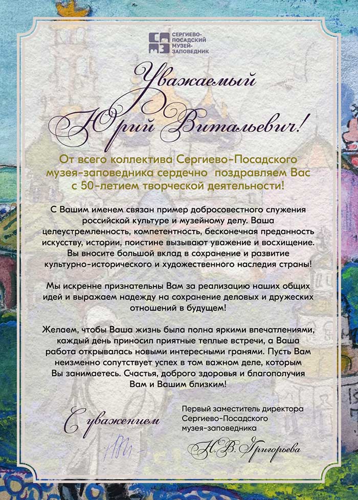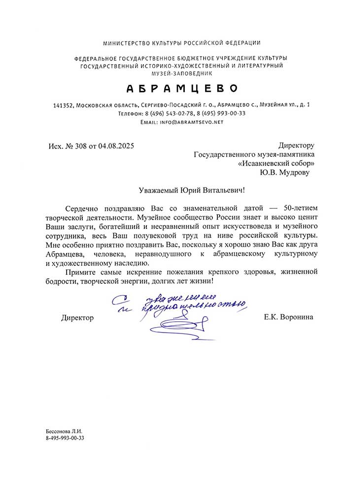 4 августа исполняется 50 лет творческой деятельности директора Государственного музея «Исаакиевский собор» Юрия Витальевича Мудрова. С юбилеем его поздравил генеральный директор Государственного Эрмитажа, президент Союза музеев России Михаил Борисович Пиотровский.