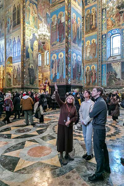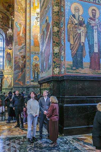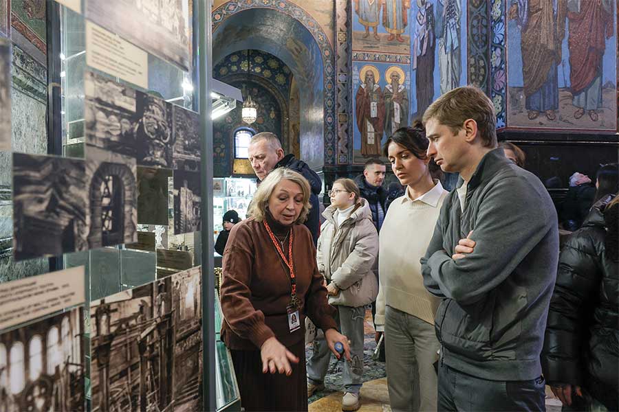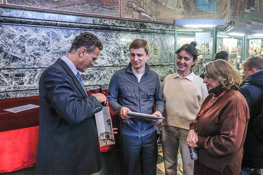 От имени директора музея Юрия Витальевича Мудрова гостей встретил начальник музея-памятника «Спас на Крови» Илья Васильевич Демидов. Он подробно рассказал о ключевых направлениях музейной деятельности, включая научно-исследовательскую работу, реставрационные и выставочные проекты, образовательные программы, а также международное и региональное сотрудничество.