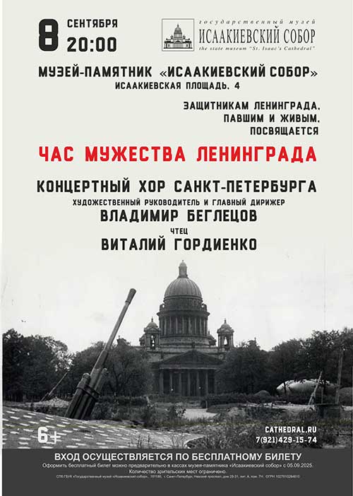 С 2006 года в этот день в Исаакиевском соборе проходят концерты хоровой музыки «Час мужества Ленинграда». У концерта есть особый ритуал. Перед его музыкальной частью заслуженный артист России Виталий Гордиенко зачитывает список сотрудников Объединенного хозяйства музеев, которые жили в подвале Исаакиевского собора во время блокады, сохраняя экспонаты пригородных музеев, которые не удалось отправить в эвакуацию.