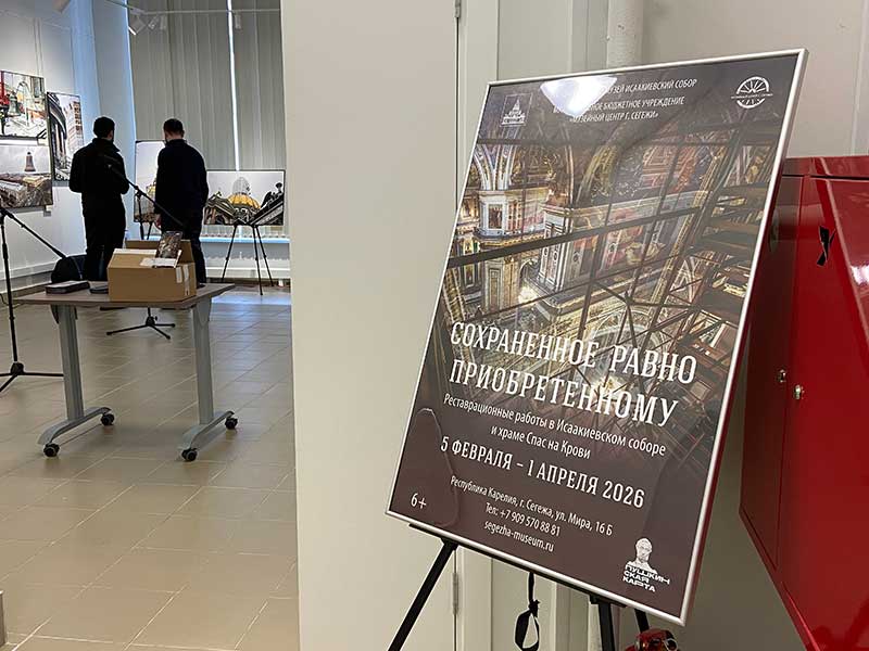5 февраля в музейном центре города Сегежа (Республика Карелия) открылась выставка «Сохраненное равно приобретенному...». Она рассказывает об одном из важнейших направлений деятельности Государственного музея «Исаакиевский собор» — систематической работе по сохранению уникального декоративно-художественного убранства храмов-памятников, входящих в его состав.