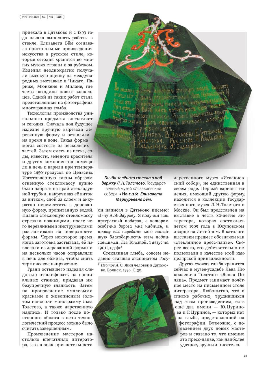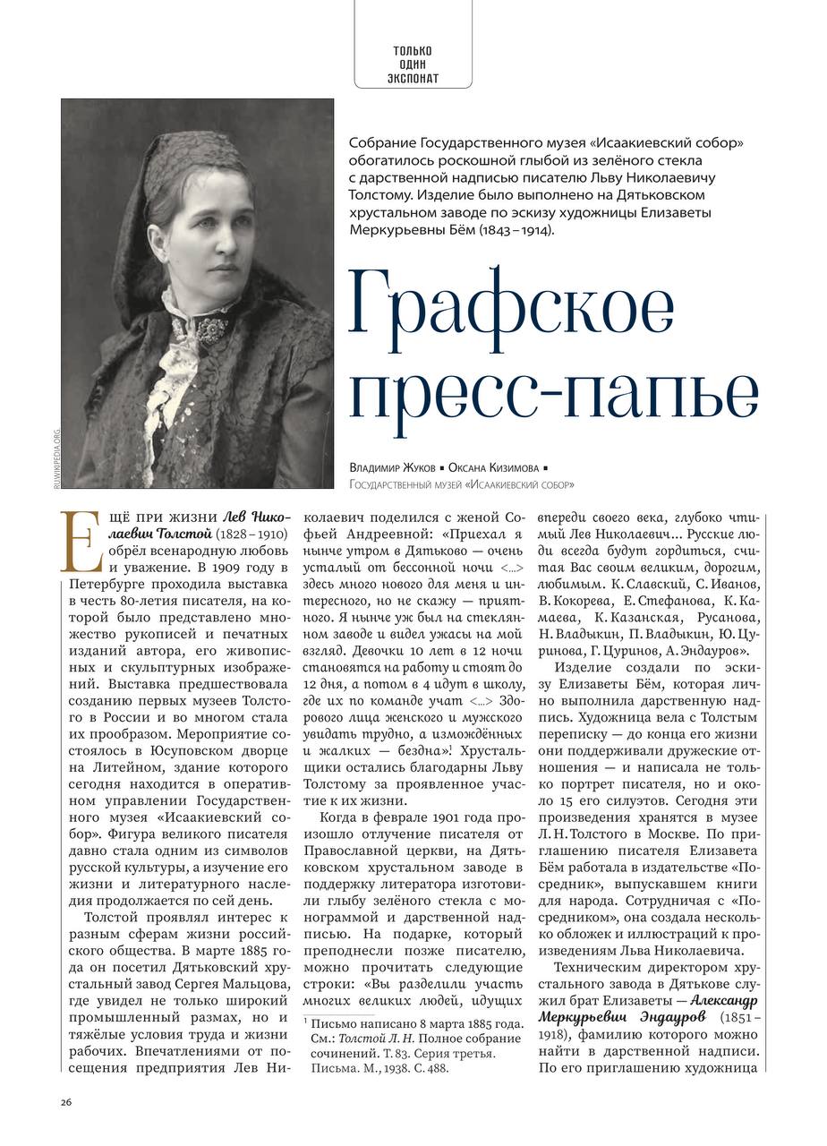 В февральском выпуске журнала «Мир музея» (№2 2026) вышла статья «Графское пресс-папье» заведующего сектором истории реставрации Государственного музея «Исаакиевский собор» Владимира Васильевича Жукова и специалиста экспозиционно-выставочного отдела фондов Оксаны Александровны Кизимовой. Посвящена она уникальному приобретению музея. Это «стеклянная глыба» (пресс-папье), созданная на Дятьковском хрустальном заводе по эскизу художницы Елизаветы Меркурьевны Бём (1843–1914) и подаренная Льву Николаевичу Толстому.