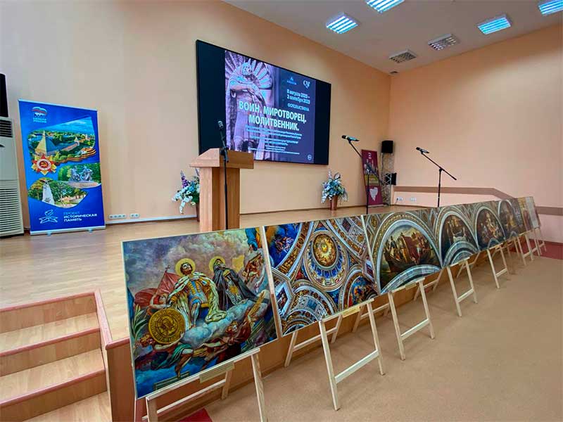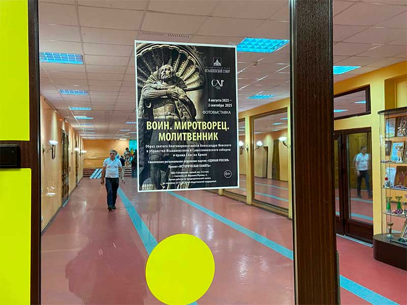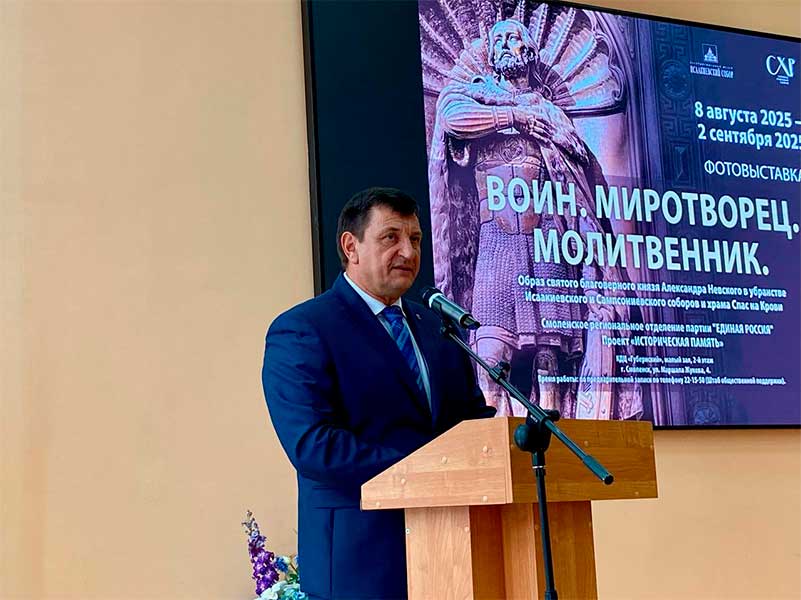 8 августа в Смоленске в культурно-досуговом центре «Губернский» в рамках проекта «Историческая память» партии «Единая Россия» состоялось торжественное открытие выставки «Воин. Миротворец. Молитвенник. Образ святого благоверного князя Александра Невского в убранстве Исаакиевского и Сампсониевского соборов и храма Спас на Крови». Организатором проекта выступил Государственный музей-памятник «Исаакиевский собор».