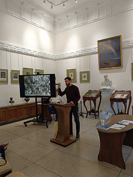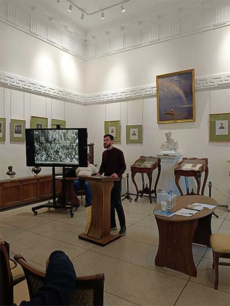 В рамках заседания с докладом выступил заведующий сектором истории реставрации Государственного музея «Исаакиевский собор» Владимир Васильевич Жуков. Его сообщение было посвящено теме «Национальная идентичность народов Российской империи в произведении А. А. Карелина «Трехсотлетие Царствования Дома Романовых».