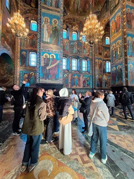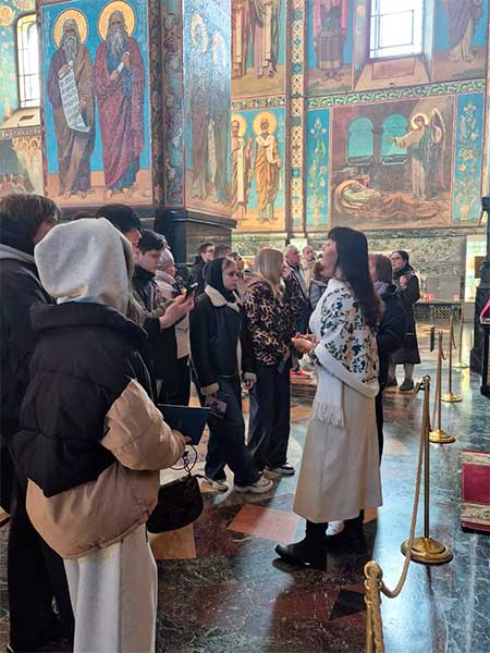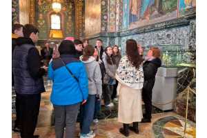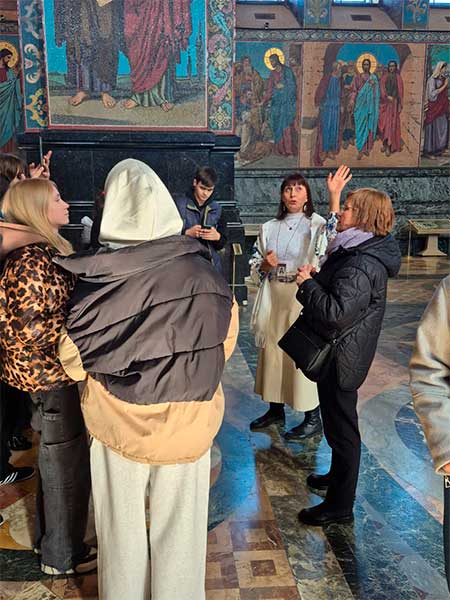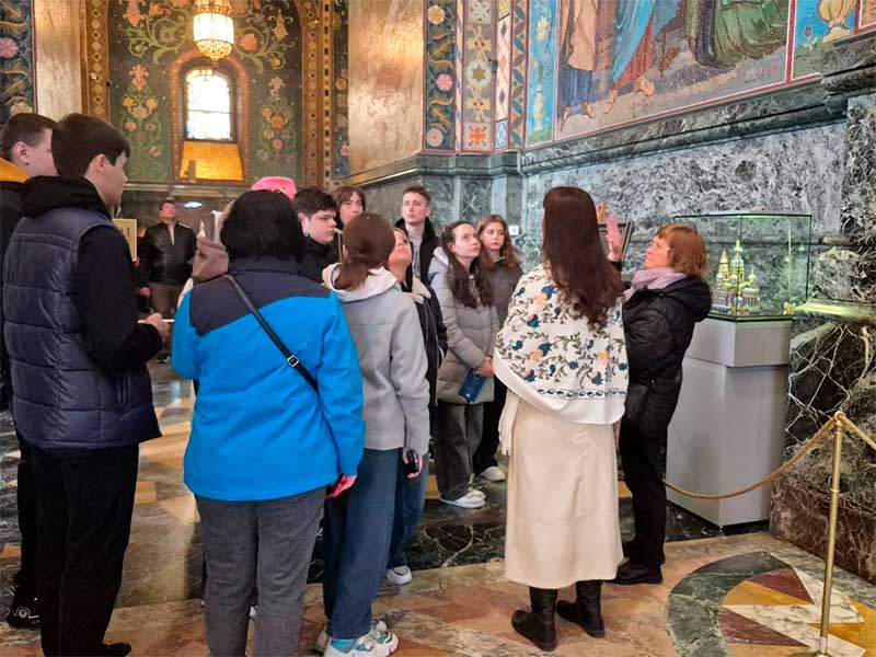 Экскурсовод Людмила Юрьевна Громцева познакомила гостей с историей создания храма Воскресения Христова (Спас на Крови), его архитектурными и инженерными особенностями, уникальным каменным и мозаичным убранством. Экскурсанты узнали о мемориальном значении Спаса на Крови, который был возведен на месте смертельного ранения императора Александра II. В западной части храма экскурсоводы показали гостям место трагедии — подлинные камни булыжной мостовой, на которые упал смертельно раненный император.