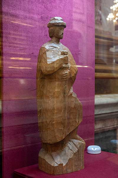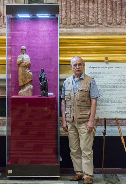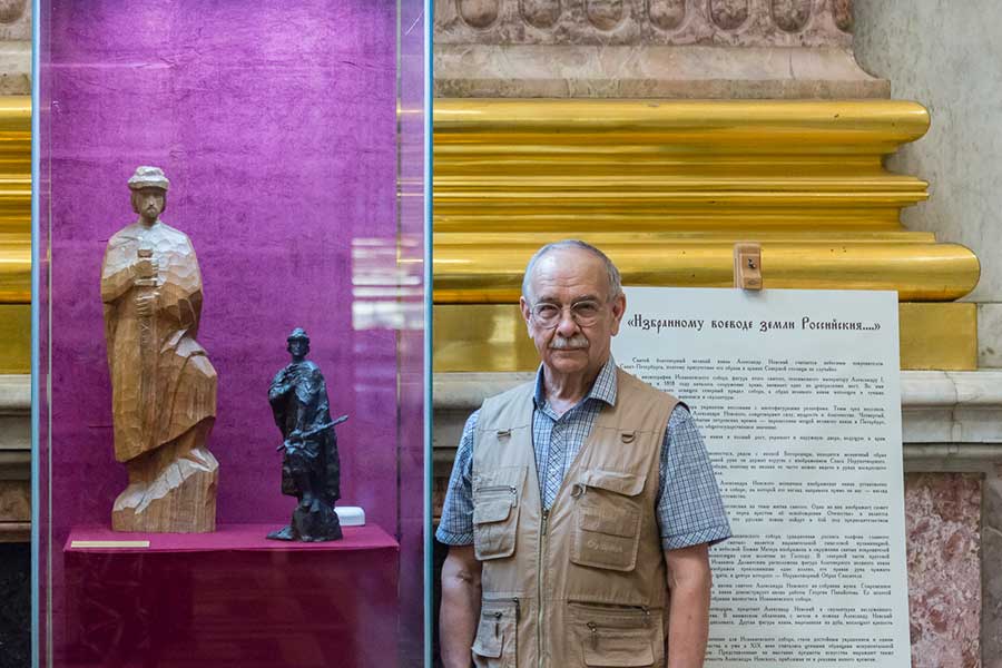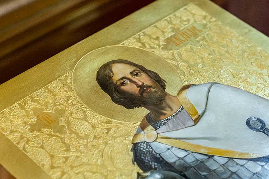 Современное прочтение иконографии благоверного князя демонстрирует икона работы Георгия Панайотова. Ее золотой рельефный фон вторит живописным образам иконостаса Исаакиевского собора. Александр Невский представлен избранным воеводой в скульптурах заслуженного художника России Бориса Сергеева. В княжеском облачении, с мечом в ножнах Александр Невский изображен в ипостаси искусного дипломата. Другая фигура князя, вырезанная из дуба, воплощает крепость воина и мощь великого полководца.