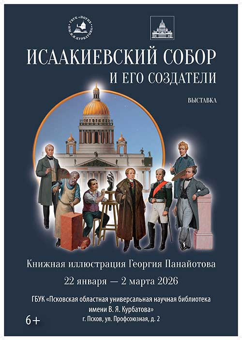 22 января в Псковской областной универсальной научной библиотеке им. В. Я. Курбатова состоится открытие выставки произведений Георгия Панайотова «Исаакиевский собор и его создатели. Книжная иллюстрация». Выставка приурочена к 240-летию со дня рождения Огюста Монферрана, архитектора Исаакиевского собора.