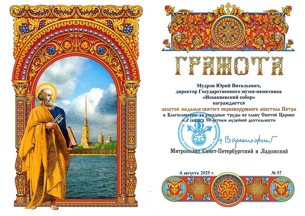 За усердное служение Святой Церкви и в связи с 50-летием музейной деятельности Юрий Витальевич был удостоен золотой медали апостола Петра.