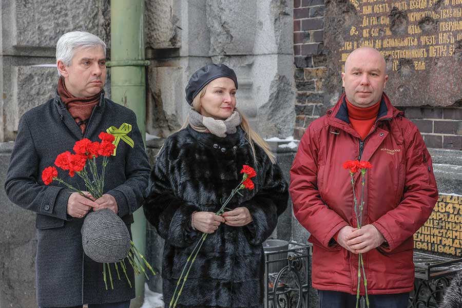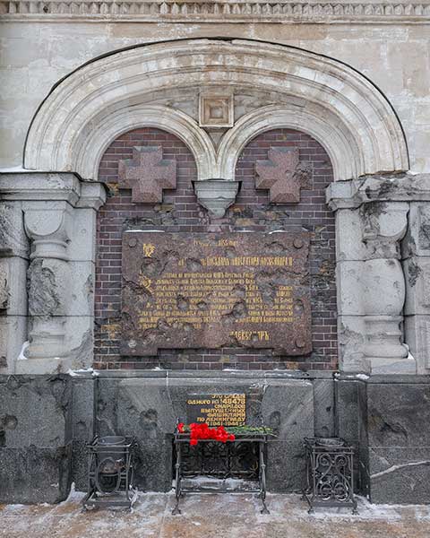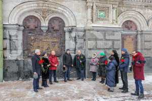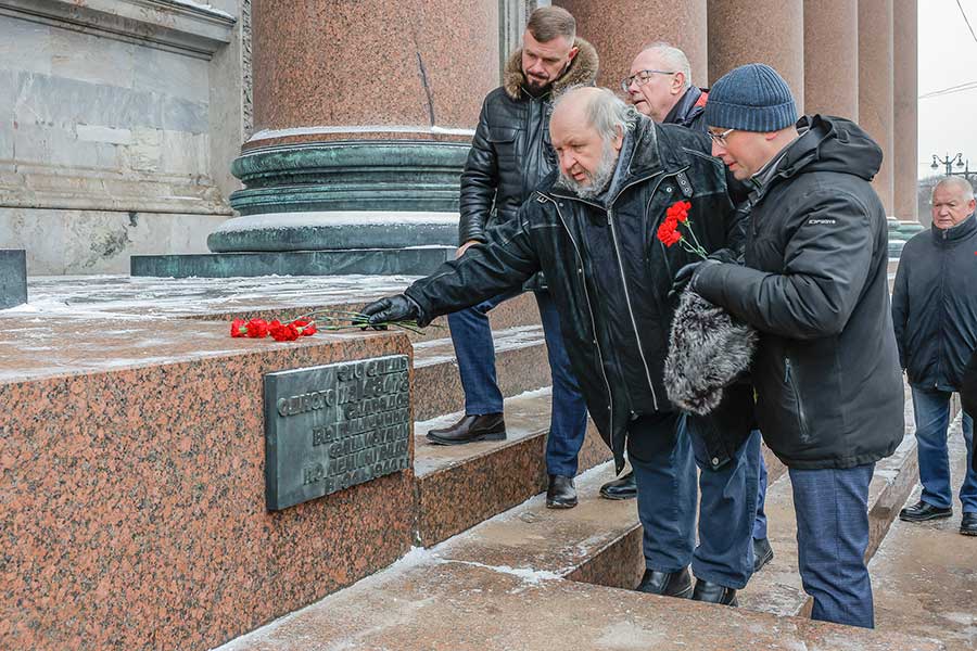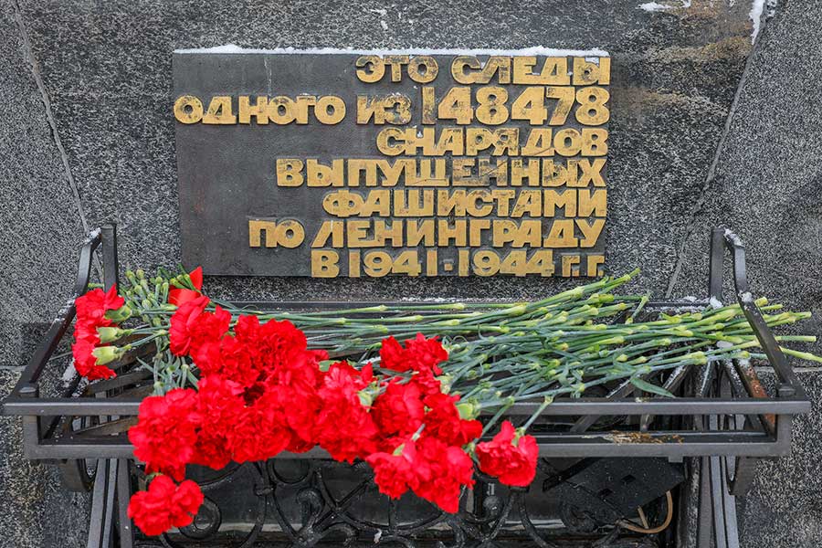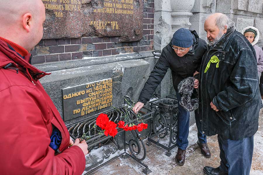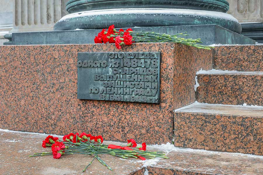 Цветы возложили к мемориальным доскам, установленным на стилобате западного портика Исаакиевского собора и на южном фасаде храм Воскресения Христова — в местах, хранящих на себе следы от снарядов, выпущенных вражеской артиллерией по Ленинграду в годы Великой Отечественной войны.