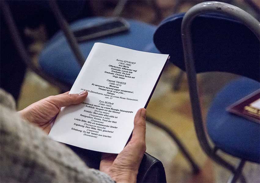 18 февраля в музее-памятнике «Спас на Крови» Концертный хор Санкт-Петербурга под управлением заслуженного артиста России Владимира Беглецова представил программу из произведений австрийской и русской музыки XIX века. Прозвучали шесть духовных хоров Антона Брукнера (1824–1896), четыре фрагмента из цикла «Двенадцать хоров на слова Якова Полонского» Сергея Танеева (1856–1915) и «Шесть духовных песен на стихи Йозефа Эйхендорфа» Гуго Вольфа (1860–1903).
