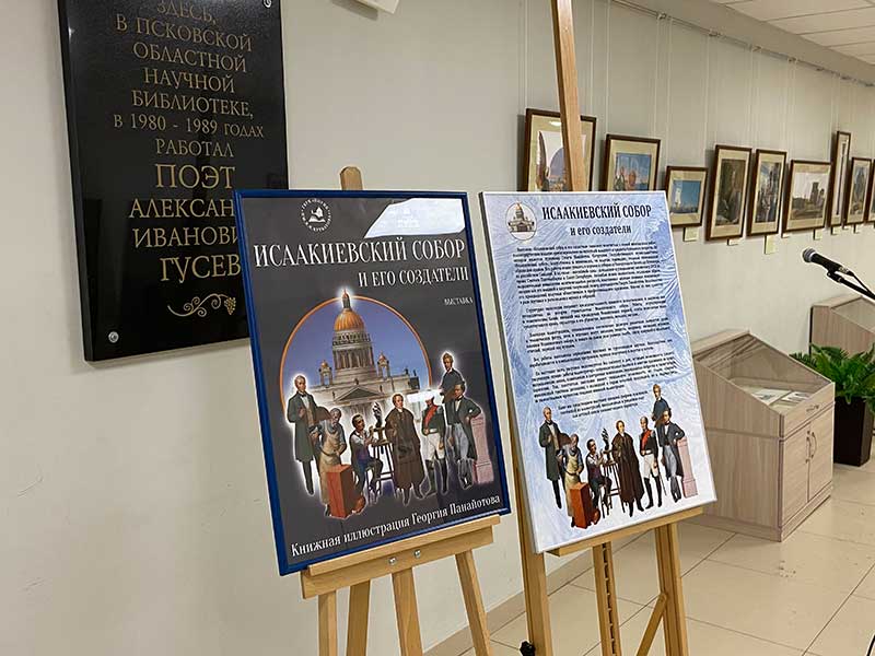 22 января в Псковской областной универсальной научной библиотеке им. В. Я. Курбатова состоялось торжественное открытие выставки произведений Георгия Панайотова «Исаакиевский собор и его создатели. Книжная иллюстрация». Экспозиция приурочена к 240-летию со дня рождения архитектора собора Огюста Монферрана.