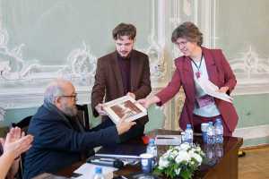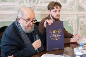 О. В. Нестерцева зачитала обращение генерального директора Государственного музея-заповедника «Архангельское» В. Н. Задорожного и передала в дар один из первых переизданных экземпляров классической монографии С. В. Безсонова (1885–1955) «Архангельское. Подмосковная усадьба», отметив, что работа над переизданием велась коллективом музея в течение двух лет.