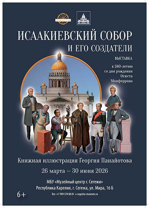 26 марта в Муниципальном бюджетном учреждении «Музейный Центр г. Сегежи» состоялось торжественное открытие выставки «Исаакиевский собор и его создатели. Книжная иллюстрация Георгия Панайотова». Экспозиция, приуроченная к 240-летию со дня рождения великого архитектора Огюста Монферрана, представляет серию живописных работ, созданных специально для детской книги «Исаакиевский собор и его создатели. 1818–1858». Издание было подготовлено Государственным музеем «Исаакиевский собор» в 2025 году. Автор — художник, искусствовед и иконописец Георгий Панайотов. Его работы можно увидеть в церквях и соборах от Бреста в Белоруссии до Кунашира на Сахалине. Его произведения получили общественное и профессиональное признание. Многие из них хранятся в крупных и региональных музейных собраниях.