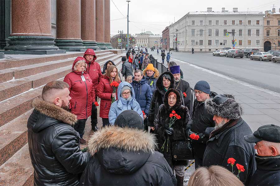 Сегодняшний день не стал исключением. Мероприятие началось у стен Исаакиевского собора. К сотрудникам музея обратился директор Государственного музея «Исаакиевский собор» Ю. В. Мудров: «Это наш духовный, душевный и человеческий долг — именно поэтому мы здесь. Мы живем в великом городе и великой стране, которая неоднократно завоевала право на самостоятельность, уважение и величие. Мы служим Отечеству, являясь частью Петербурга, Ленинграда, России и Русской православной церкви — духовного стержня нашей государственности».