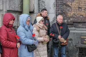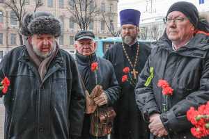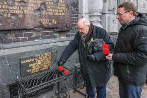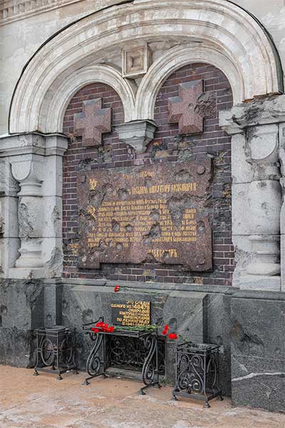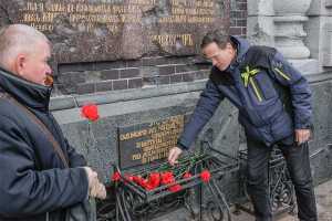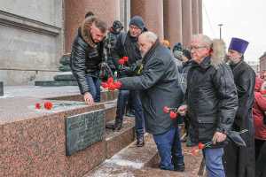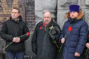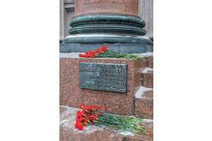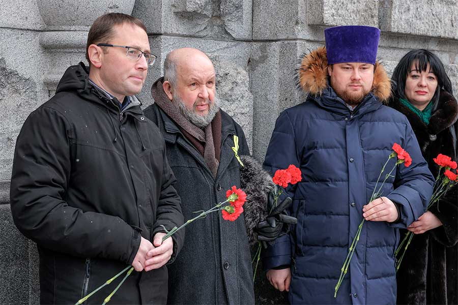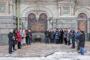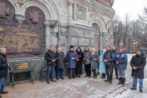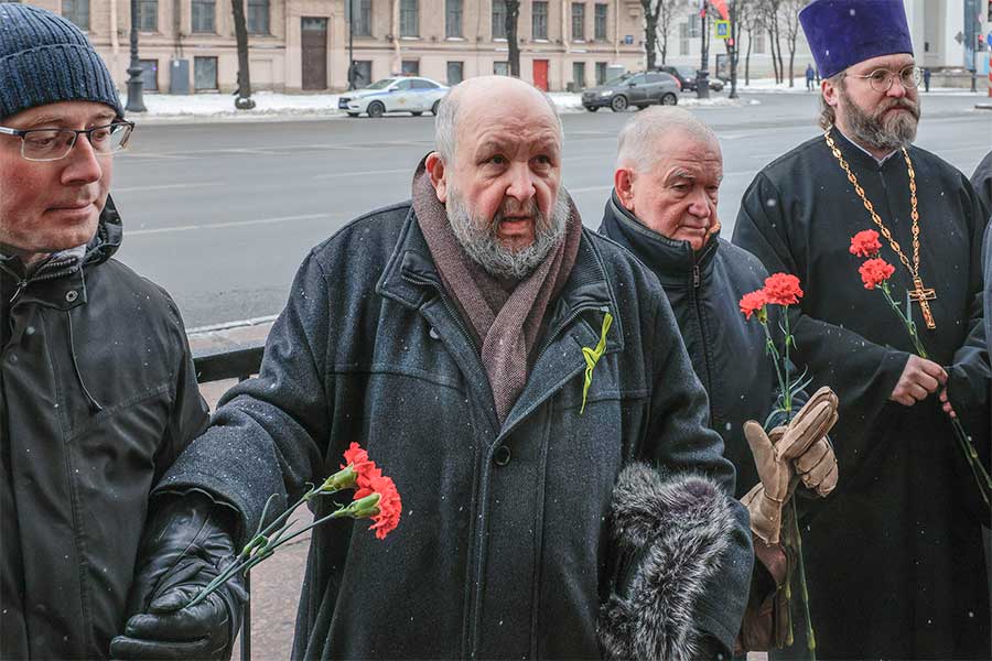 Торжественно-траурное мероприятие продолжилось у стен южного фасада храма Воскресения Христова, где сотрудники и гости музея почтили память возложением цветов к мемориальной доске. Здесь, под отметинами войны на стенах храма, Юрий Витальевич отметил, что Спас на Крови имеет свою блокадную историю, являясь свидетелем и участником тех великих героических дней.