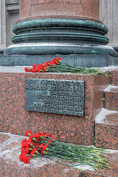 Город постоянно подвергался обстрелам со стороны немецкой артиллерии и авиации. Осколки бомб и снарядов оставили выбоины на колоннах Исаакиевского собора и стенах храма Воскресения Христова (Спас на Крови). Во время реставрационных работ эти следы сохранили как напоминание о суровых блокадных годах. На стилобате западного портика Исаакиевского собора, а также у южного фасада Спаса на Крови, под памятной доской, посвященной восшествию на престол государя императора Александра II, были установлены бронзовые доски с текстом: «Это следы одного из 148 478 снарядов, выпущенных фашистами по Ленинграду в 1941–1944 гг.». Ежегодно сотрудники Государственного музея «Исаакиевский собор» возлагают цветы к мемориальным табличкам, отдавая дань уважения героям, которые проявили беспримерное мужество и стойкость.