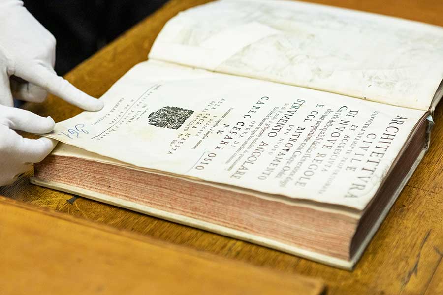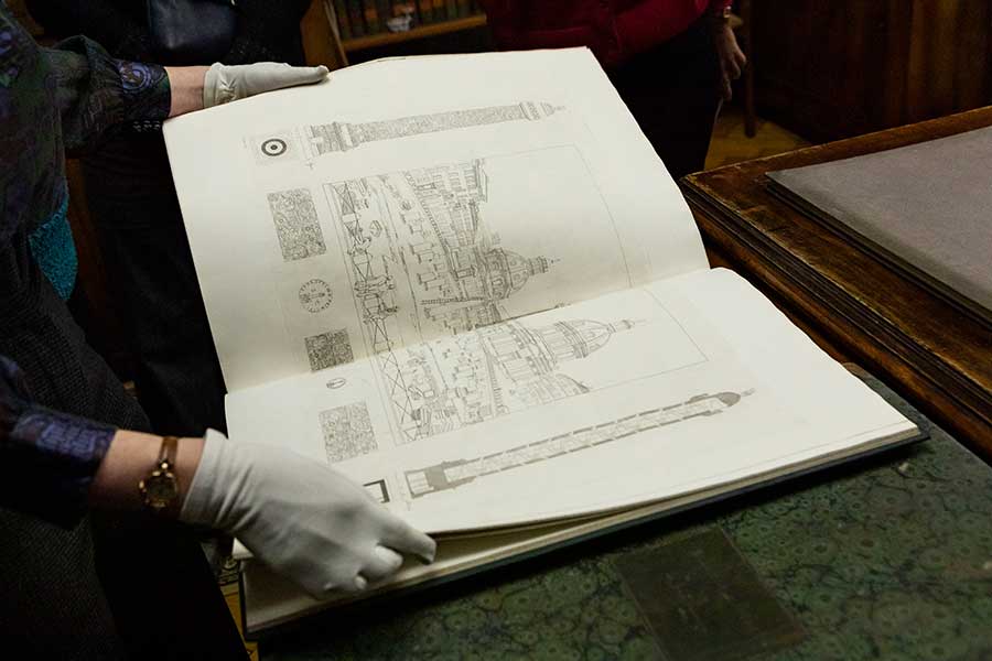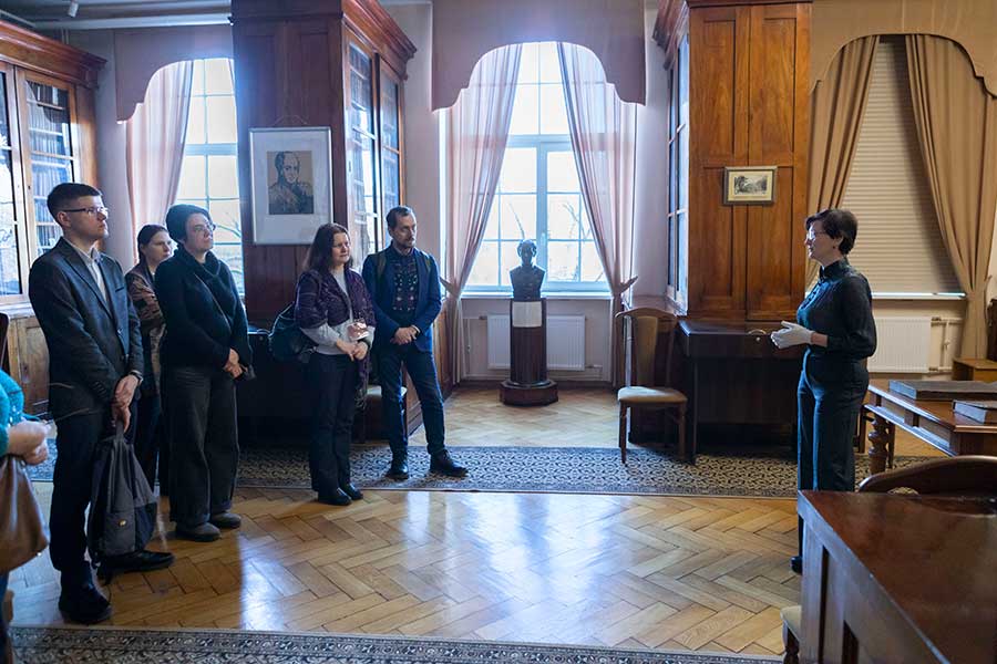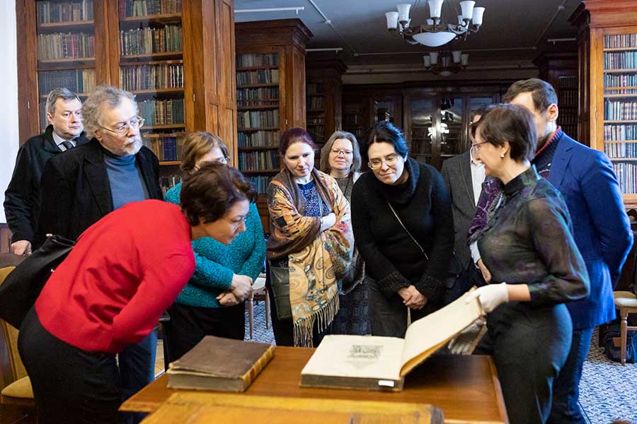 На следующий день в рамках мероприятия для докладчиков было организовано посещение Научно-технической библиотеки Петербургского государственного университета путей сообщения Императора Александра I для знакомства с коллекцией книг из личной библиотеки Монферрана.