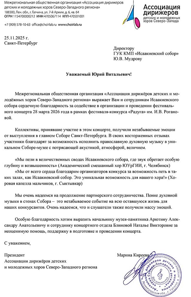 28 марта в Государственном музее «Исаакиевский собор» состоялся фестивальный концерт хоровой музыки пятого Всероссийского открытого хорового фестиваля-конкурса «Радуга» имени И. В. Рогановой.
