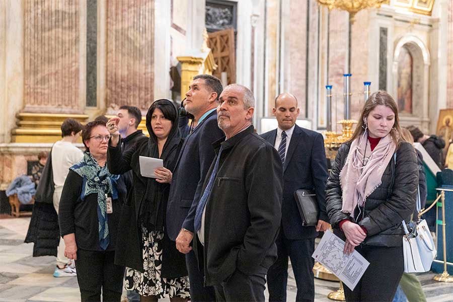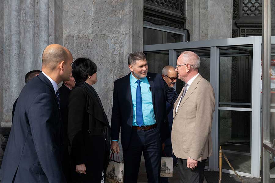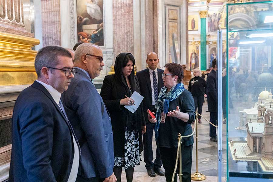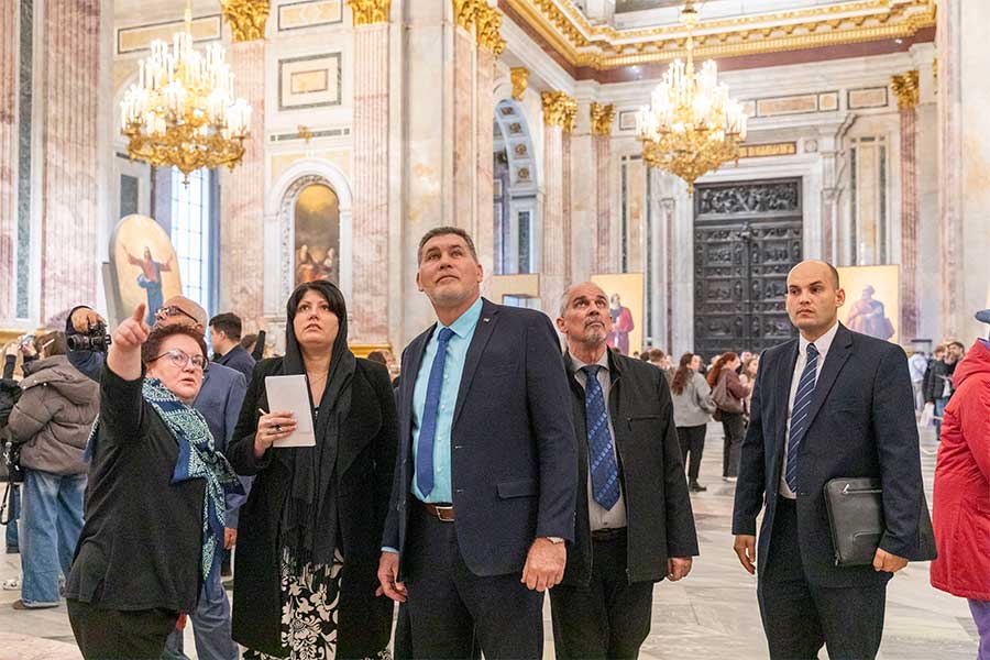 Гости познакомились с двумя знаковыми объектами, важнейшими памятниками культурного и духовного наследия. В ходе экскурсии по Исаакиевскому собору участники делегации узнали об уникальной истории строительства одного из крупнейших купольных храмов. Особое внимание было уделено инженерным решениям, позволившим возвести это архитектурное сооружение, а также его богатейшему художественному убранству — мозаикам, живописи и скульптуре. Гости смогли оценить роль собора в культурной жизни Санкт-Петербурга и России, прочувствовать масштаб замысла архитектора и мастерство исполнителей.